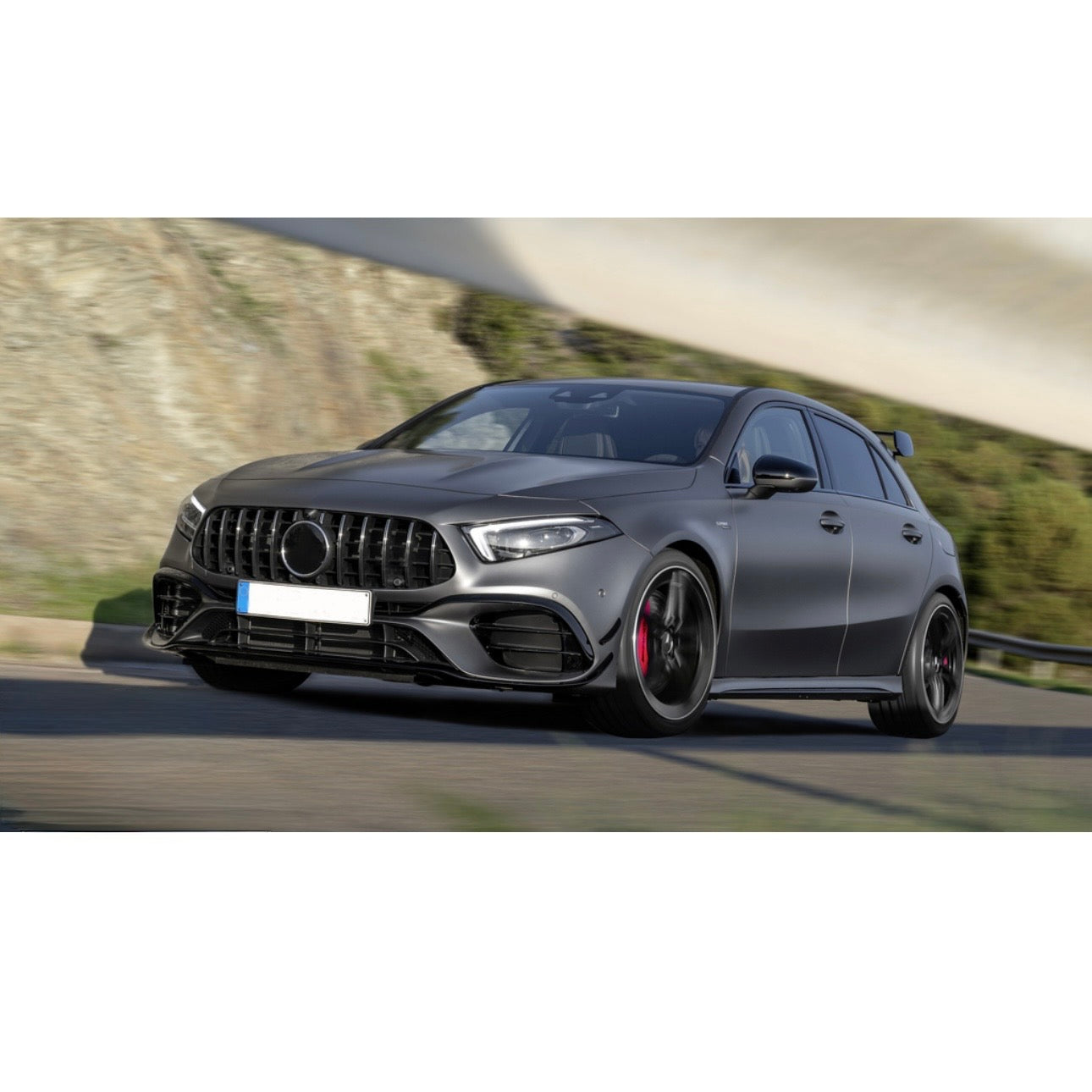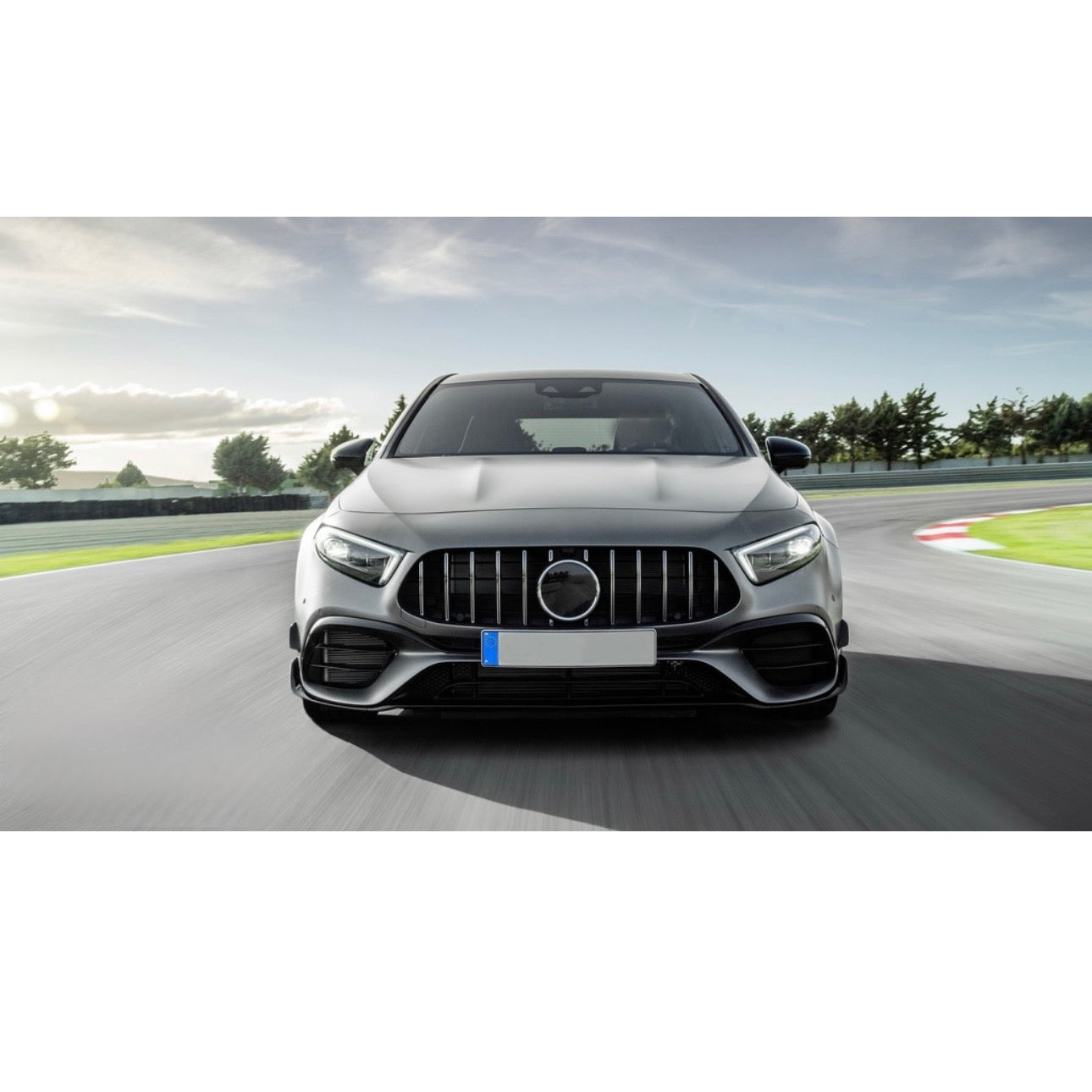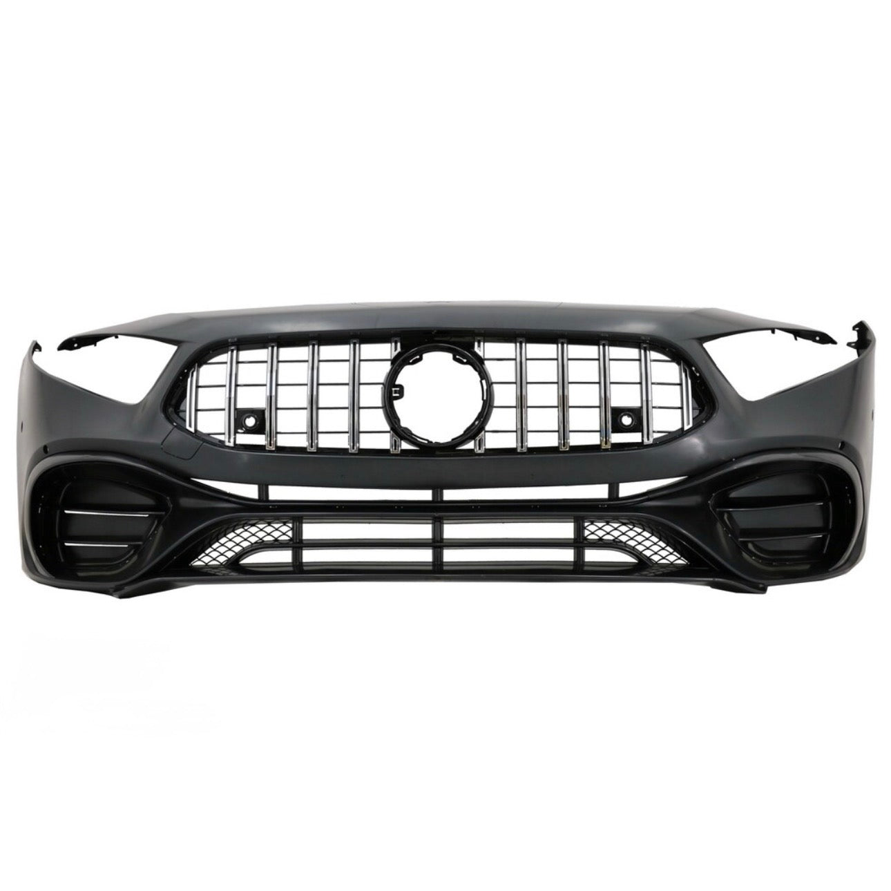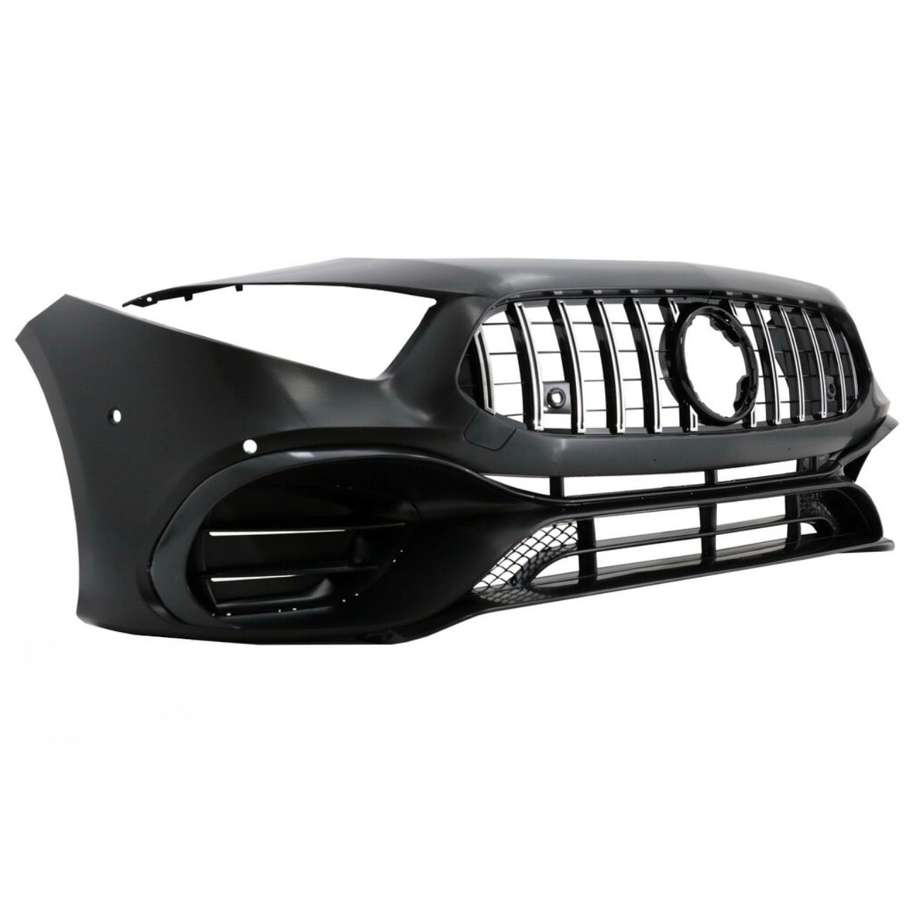 Kit paraurti anteriore stile A45 AMG completo per Mercedes Classe A W177, comprende paraurti anteriore completo con le varie griglie e accessori.
